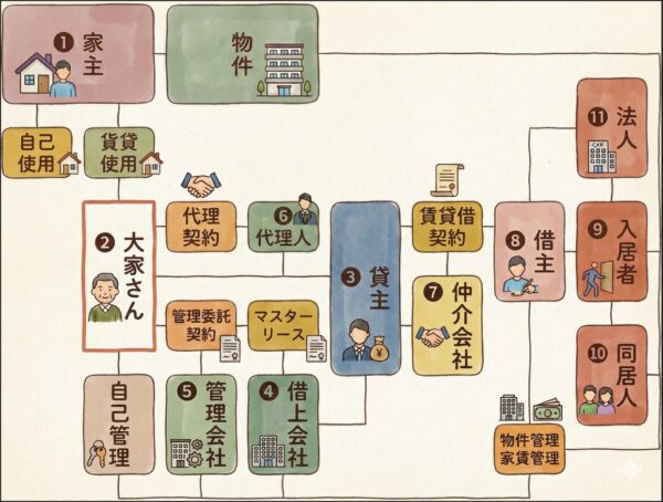 - ❸貸主 → ❷大家さん or ❹借上会社